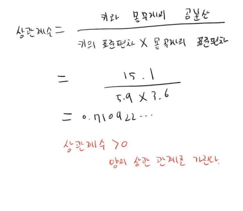 상관계수=데이터의 공분산/데이터의 표준편차 × Y데이터의 표준편차