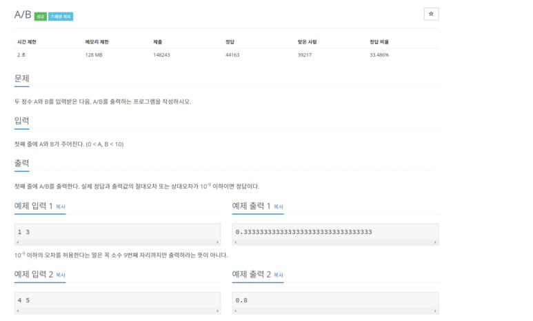 A와 B를 입력 받아서 A/B의 값을 출력하면 된다. 이 과정에서 중요한 점은