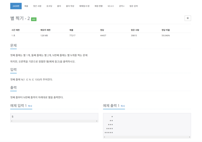 이 문제는 이중 반복문을 이용하여 풀 수 있습니다. 이 전의 2438 문제를 응용하여 풀면 되는데요. 언제 별표를 찍어야하고, 언제 공백을 그려야 할 지, 생각해보시고, 직접 손으로 한번 짜보신 후에 풀어보시면 쉽게 풀 수 있을거라고 생각합니다. 힌트라면 별표의 개수가와 Newline의 개수가 똑같다는걸 생각해보시면 될 듯합니다.