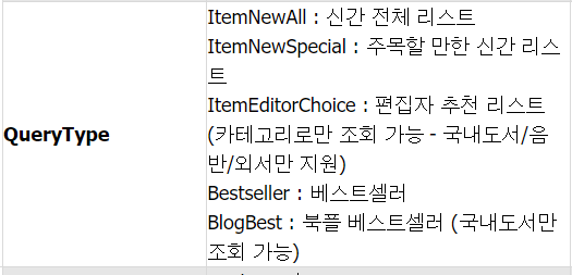 그리고 QueryType은 BestSeller로 되어 있는데, 아래와 같이 다른종류의 목록도 된다.