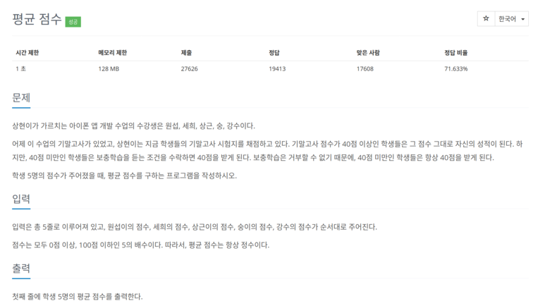 이 문제는 5명의 평균점수를 구하는 것이기 때문에 반복문으로 점수를 5번 입력받아서 입력받을 때마다 값을 비교하여 예외 처리를 해주고, 더해준 후, 마지막에 5로 나누어서 출력해주면 되는 간단한 문제입니다.