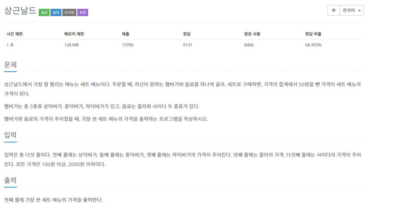 이 문제는 단품 메뉴와 세트메뉴 각각을 배열로 값을 입력 받아서 단품 메뉴의 값을 입력 받은 후, 세트메뉴의 가격을 직접 구하여, 배열에 집어 넣은 후, 세트 메뉴 배열 안에서 최솟값을 찾아서 출력하는 방식으로 문제를 풀었습니다.