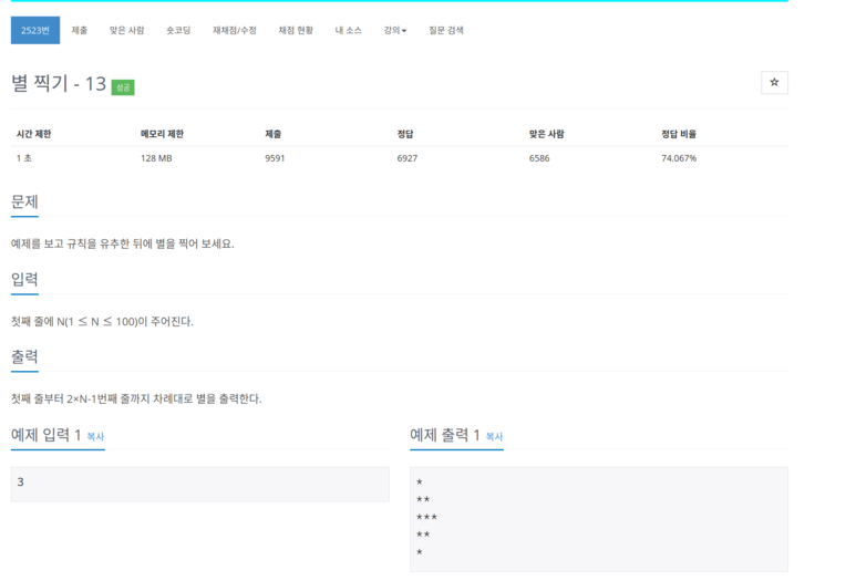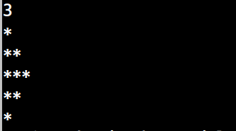 이 문제는 이중 반복문을 이용하여 풀 수 있습니다. 제가 생각한 방법은 우선 1~N번째 줄까지 그리는 for문을 구현하고, 그 후, 나머지 N~2*N-1 까지의 별표를 그리는 식으로 구현하였습니다.